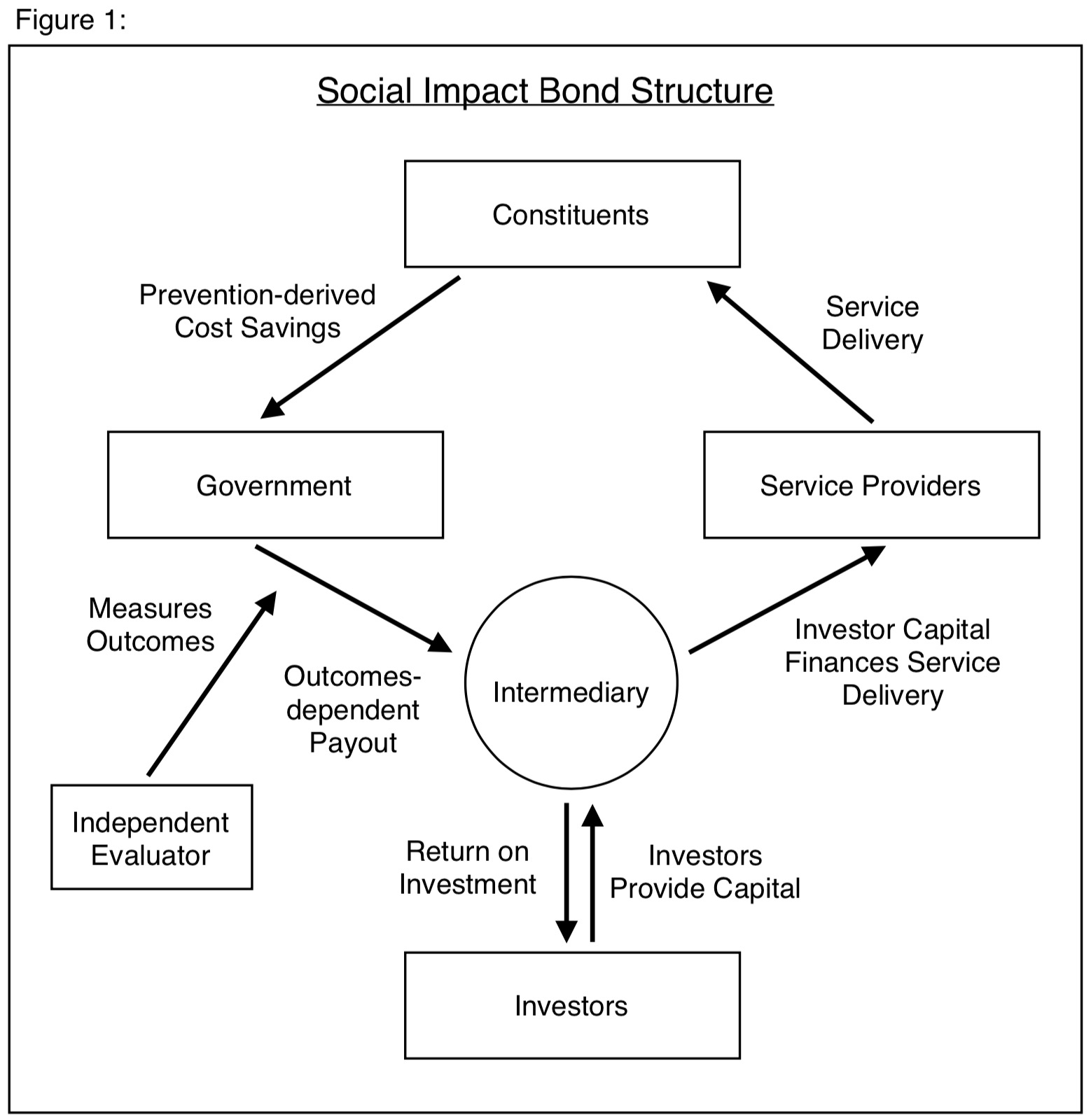The government initiates the formation of a SIB by contracting with an intermediary. The intermediary is tasked with raising capital from investors, and then using the capital to select, finance, and manage one or more service providers. Moreover, the intermediary is the central point of contact between the government, investors, and service providers. The selected service providers use the capital to deliver an evidence-based intervention that creates a positive social impact for constituents; appropriate interventions should generate government savings by using prevention as a means of reducing the size of publicly financed remedial programs. A best practice is to require that participating service providers be invested in the SIB in order to align incentives.